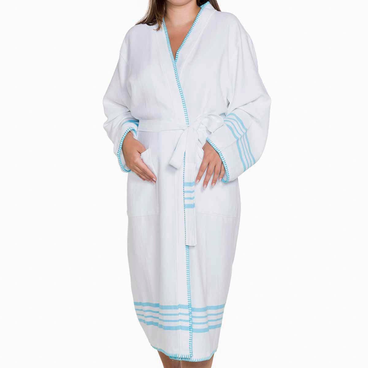 Beyaz Çoban Sultan Kimono Yaka Bornoz Beyaz - Turkuaz