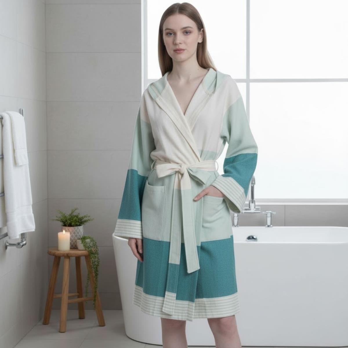 Hooded Bathrobe Twin Sultan 100% Cotton 500 Gram Pre-washed fabric Yarn dyed Our Twin Sultan bathrobe with its simple and stylish design, you can continue to feel relaxed after the bath, easily absorbs the excess water in the body.You can use this bathrobe, daily or as a gift to your loved ones, as a home wear or beach wear. It has a very soft texture and water absorbency is high. Can be produced with or without fringes. If you are willing something else than it shows here, our delivery time extend around 4-5 days. Since our motto is "naturesake" no harmful chemicals are used in our production.