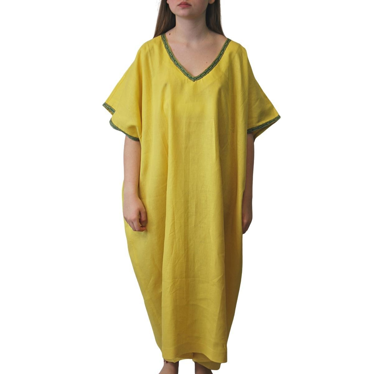 Long Linen Loose Fit Dress V Neck with Binding Detailed 100% Linen 880 gram One size fits all. Flaunt your chic style without compromising on comfort with this long linen summer dress, complete with short sleeves and bindings! Turn heads wherever you go and look stylish all day long. A versatile and comfortable addition to your wardrobe. This dress features a relaxed fit that drapes elegantly, making it suitable for various occasions. The linen fabric adds a touch of natural texture, and the placket detail enhances its unique charm.