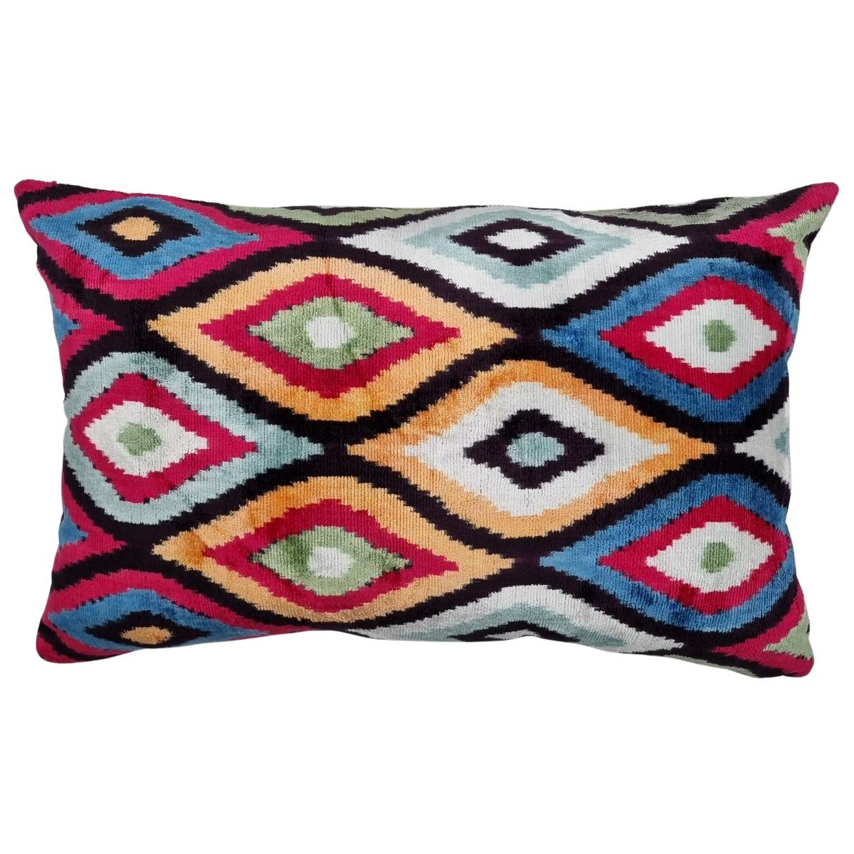Decorative Velvet Ikat Pillow Cushion 60 x 40 cm 260 gram Luxurious cushion cover of handloomed Uzbek ikat fabric. Ikat is an beautiful fabric, every pillow is unique but can also contain small imperfections; the charm of a handmade product. Insert is not included Handloom 100% silk velvet fabric Back side is cotton fabric and with hidden zipper.
