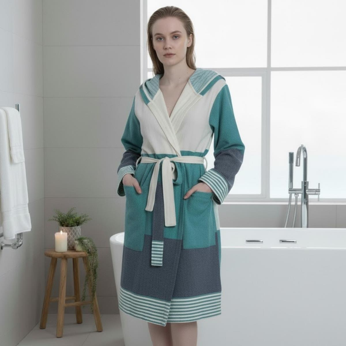 İkiz Sultan Kapüşonlu Bornoz Fanfare Yeşili - Lacivert - Ham (01BOKKL3RKPS)